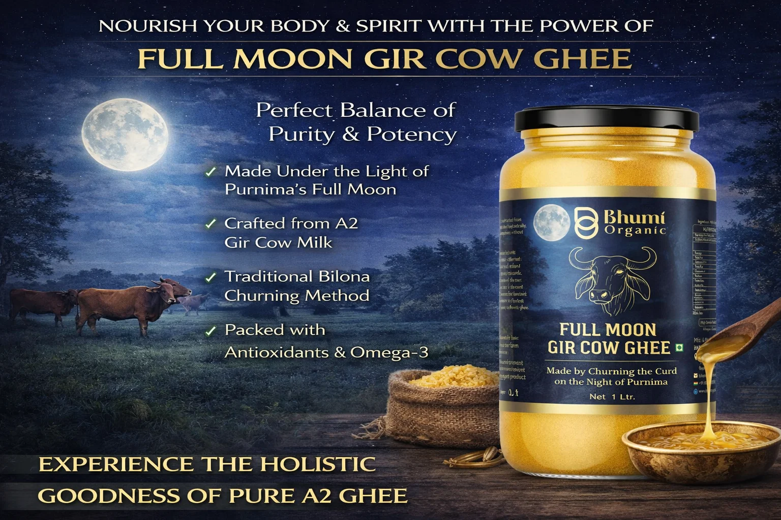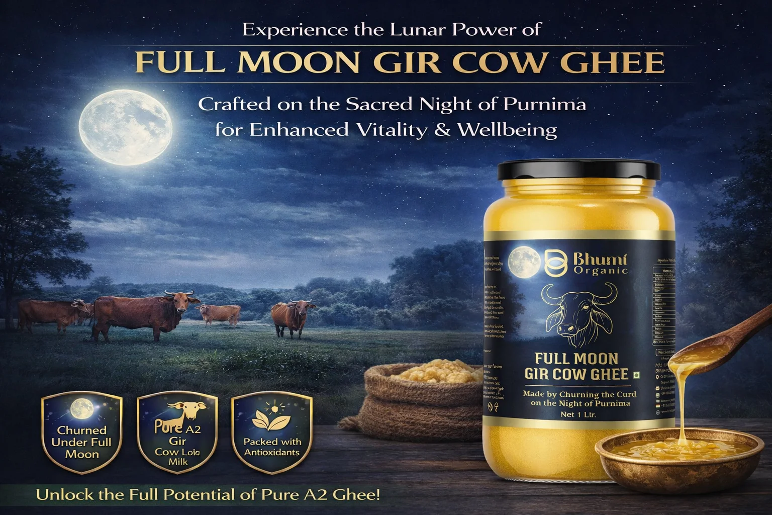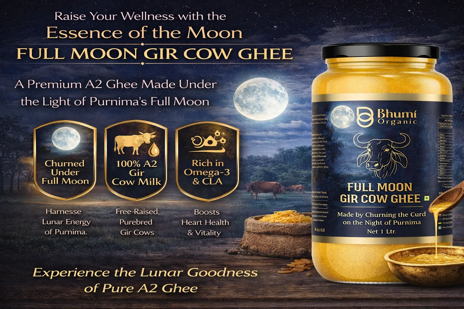 Full Moon Gir Cow A2 Bilona Ghee | Made from Curd | 1 LTR