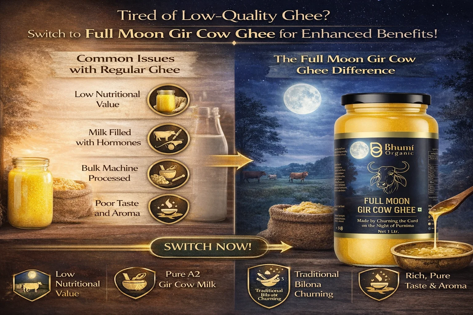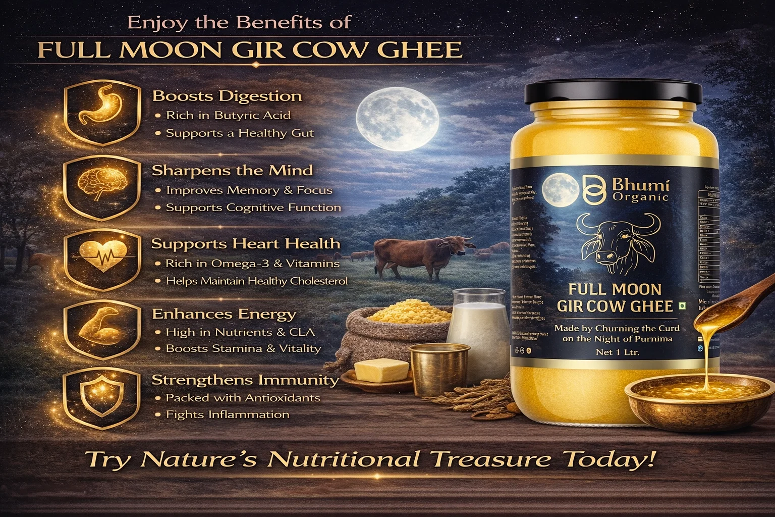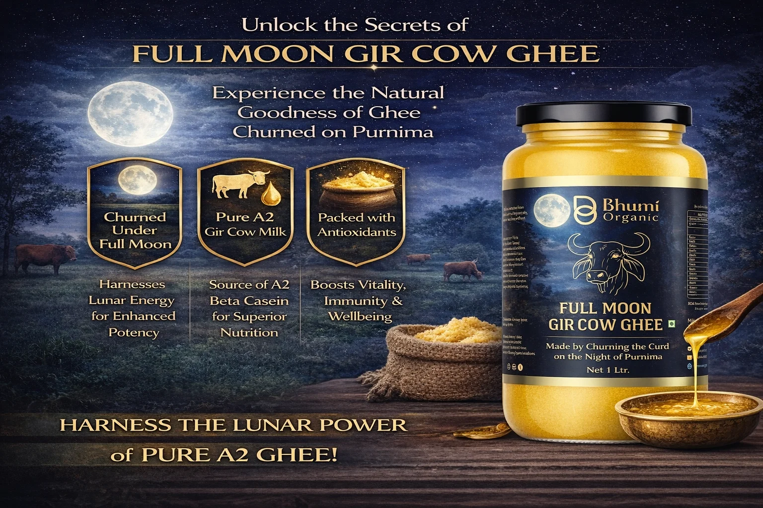 Full Moon Gir Cow A2 Bilona Ghee | Made from Curd | 1 LTR